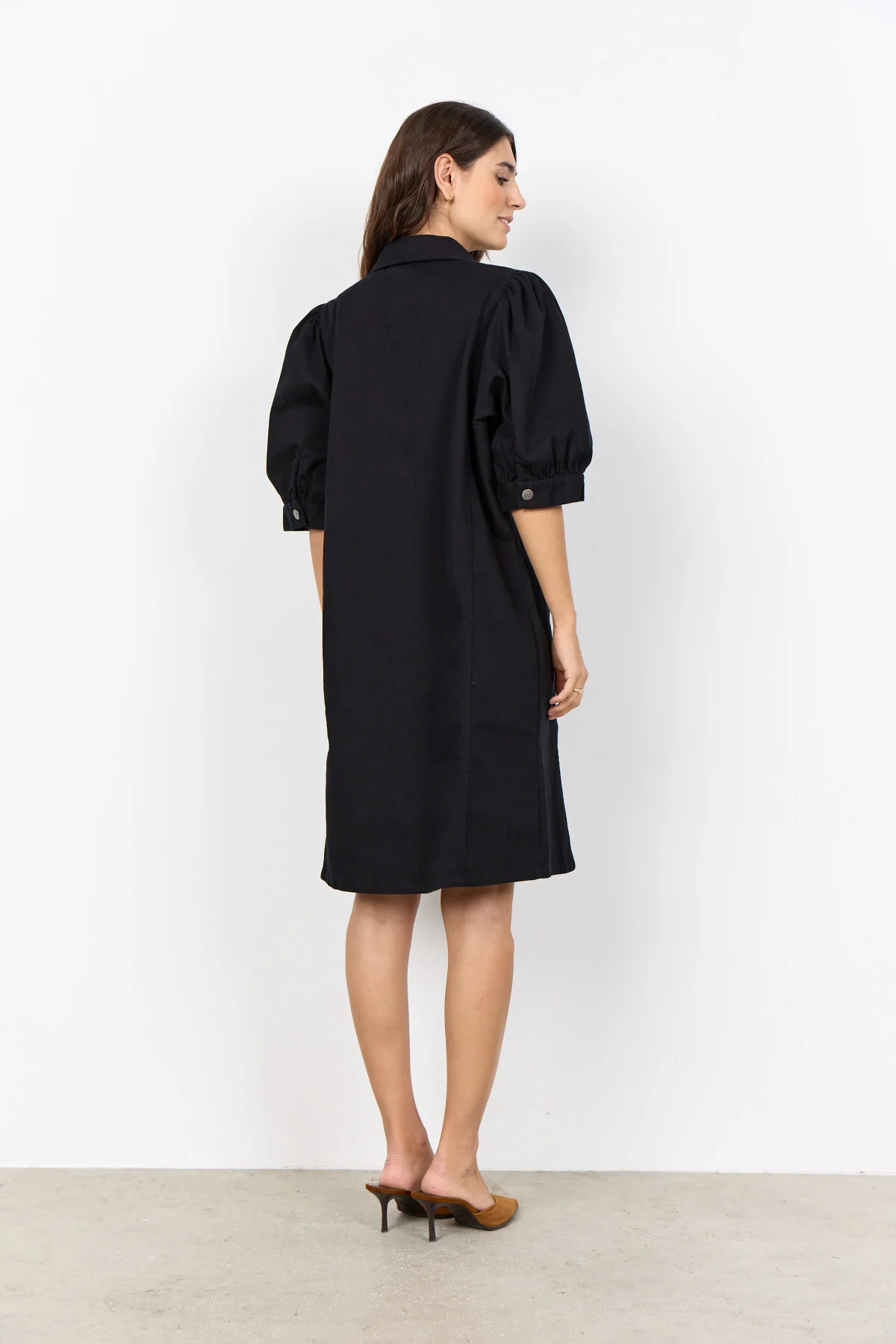 SC-BESS 6 is a Dress made from 97% Cotton, 3% Elastane. This elegant dress features a classic collar, full button-down front, and knee-length cut with subtle puff sleeves for added style. Pair it with sleek heels or casual sneakers for different looks.