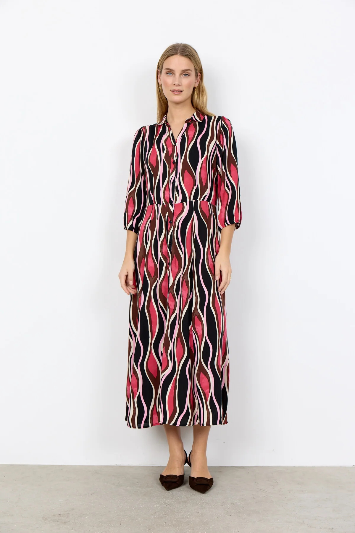 SC-CAMMI 5 Dress made from 100% LENZING™ ECOVERO™ Viscose. This elegant dress has a collared neckline, button-down front, and a striking wavy print that adds a touch of uniqueness. It pairs wonderfully with neutral-toned accessories for an effortlessly stylish look.