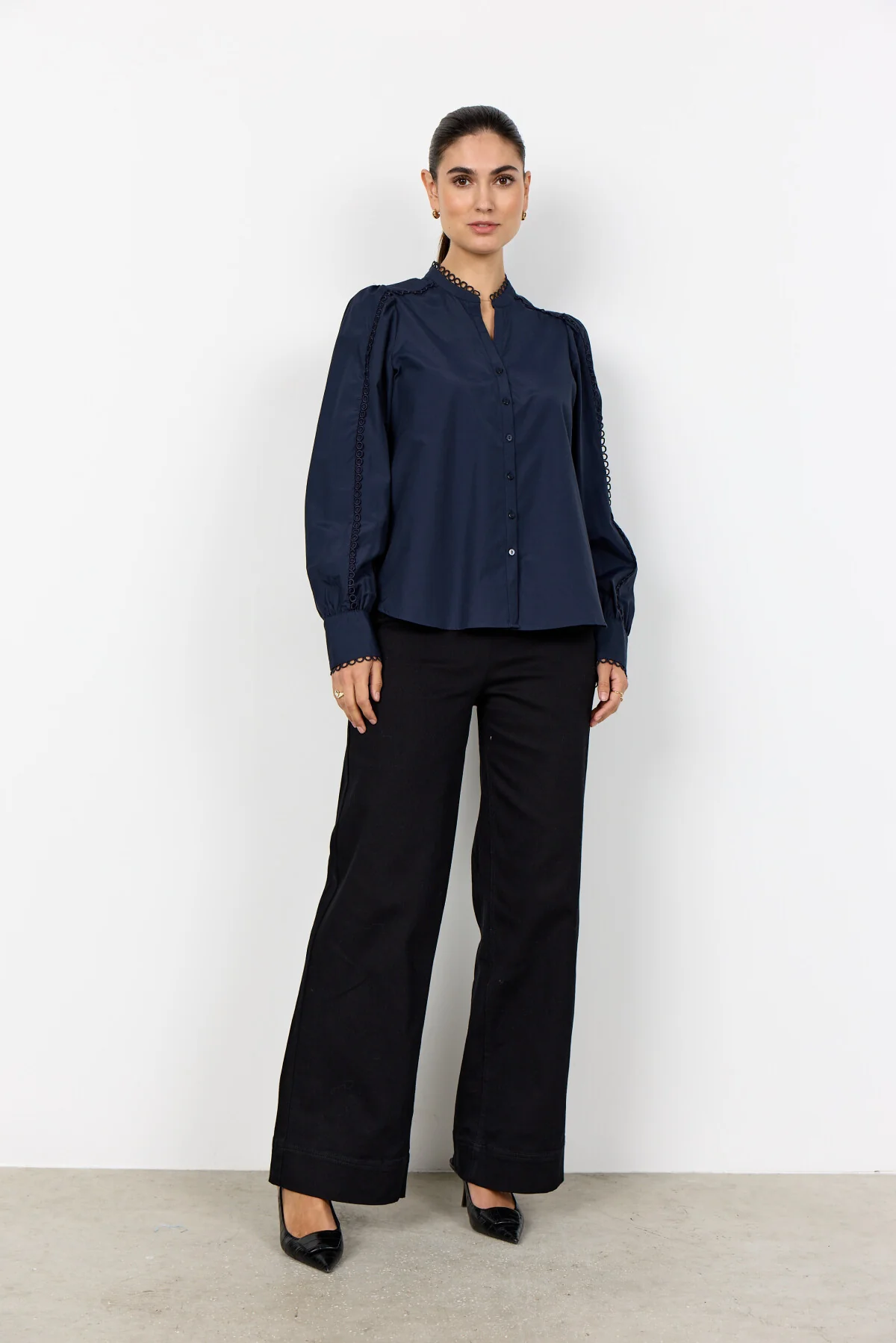SC-NETTI 120 Shirt is crafted from 53% recycled polyester and 47% organic cotton. It has a delicate lace trim along the collar and cuffs, button-down front, and elegant detailing on the sleeves. Pair it with slim trousers and simple accessories for a cool and elegant style.