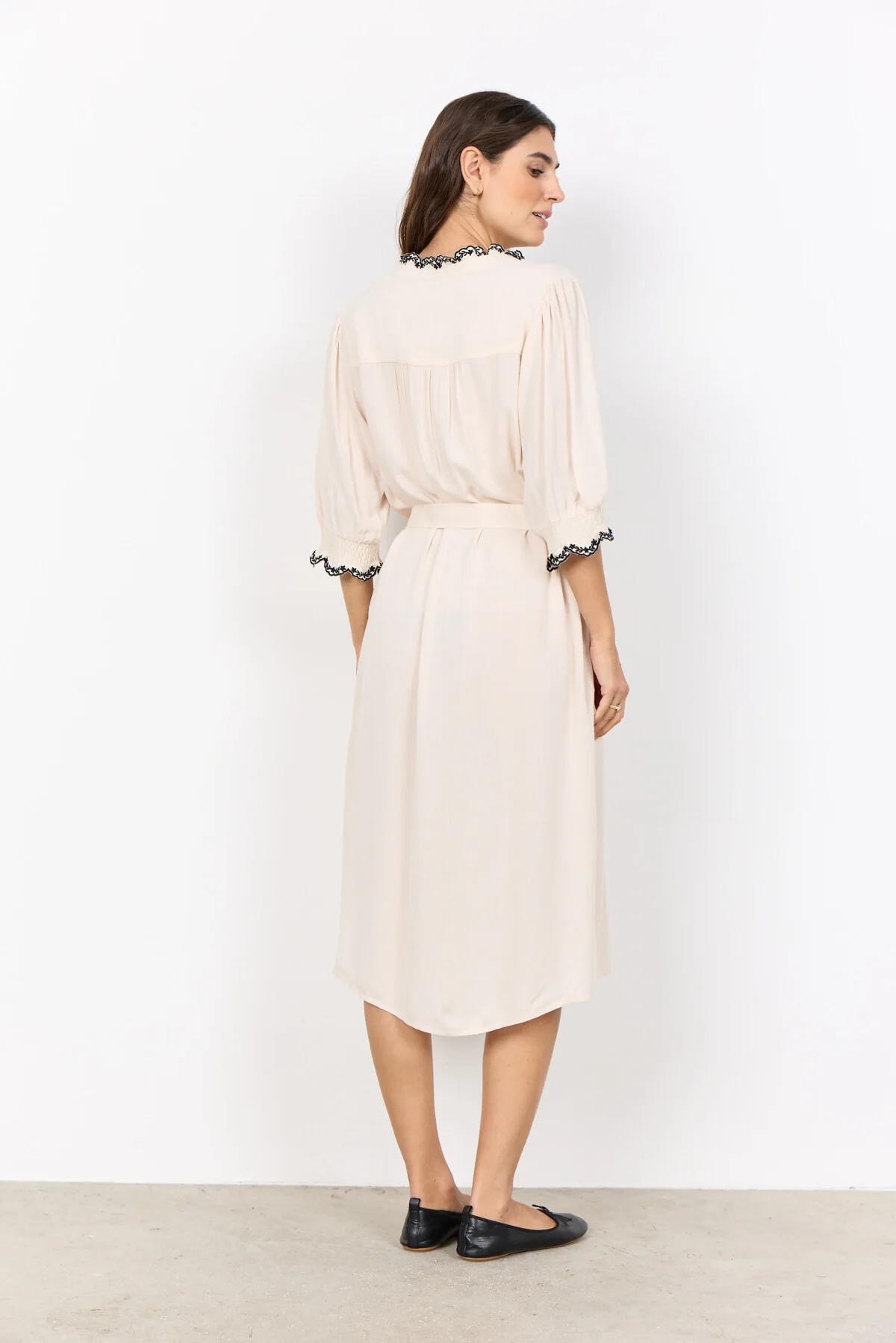 SC-RADIA 231 Dress is crafted from 100% LENZING™ ECOVERO™ Viscose. It features a graceful high collar with lace detailing, half-length sleeves, and a front button closure, complemented by a tie waist. Pair it with ankle boots and a textured clutch for a refined look.